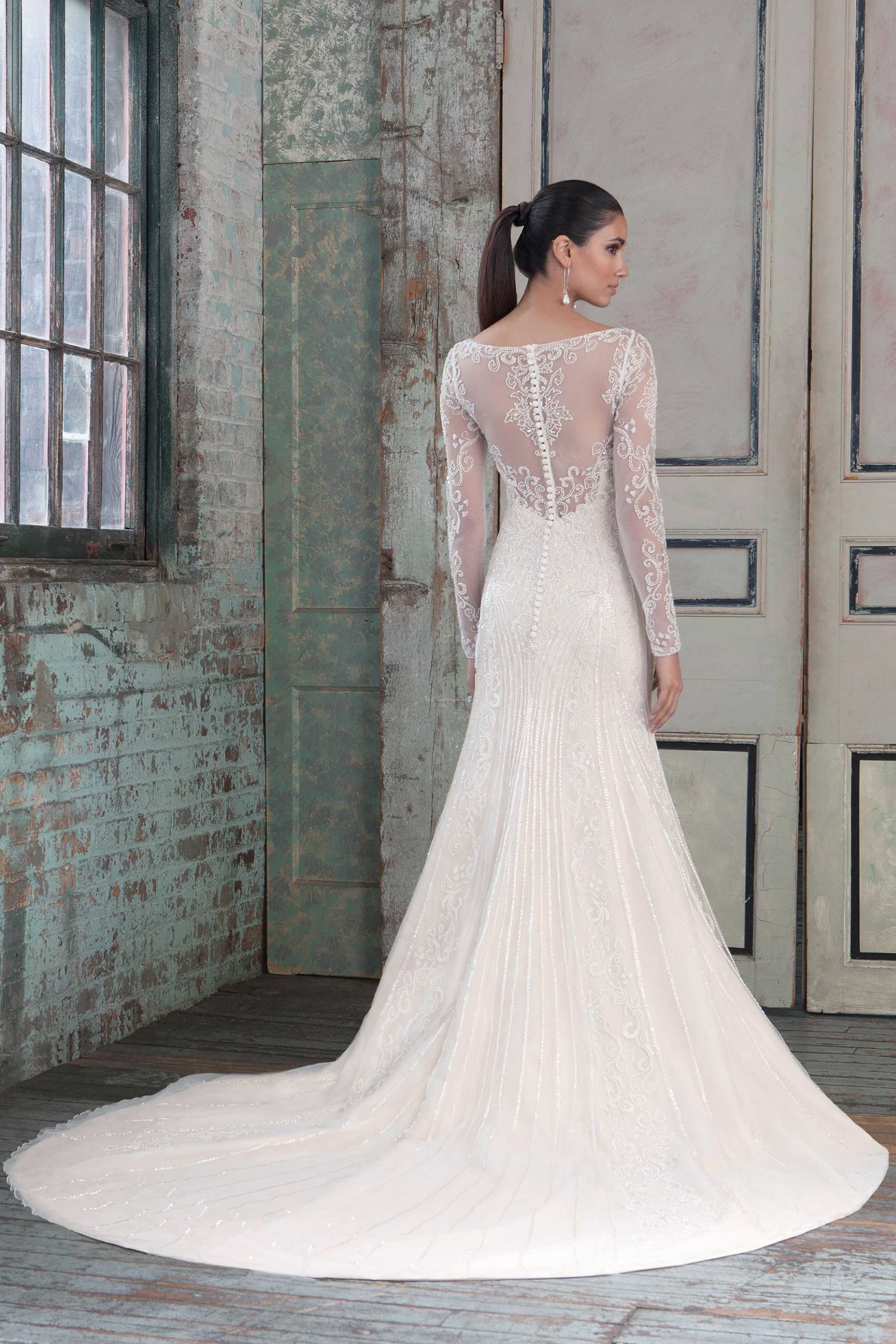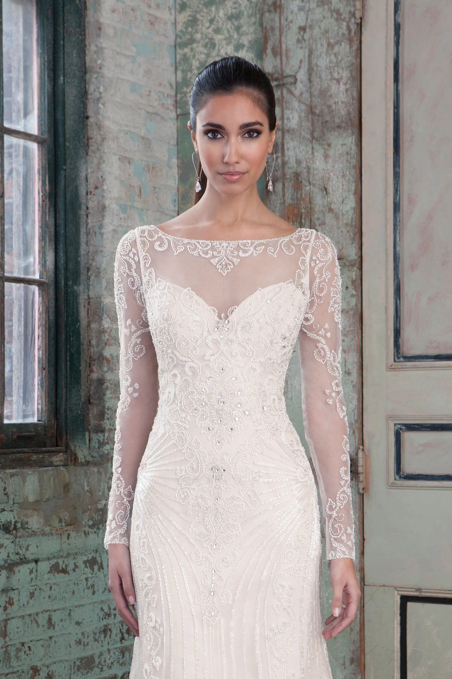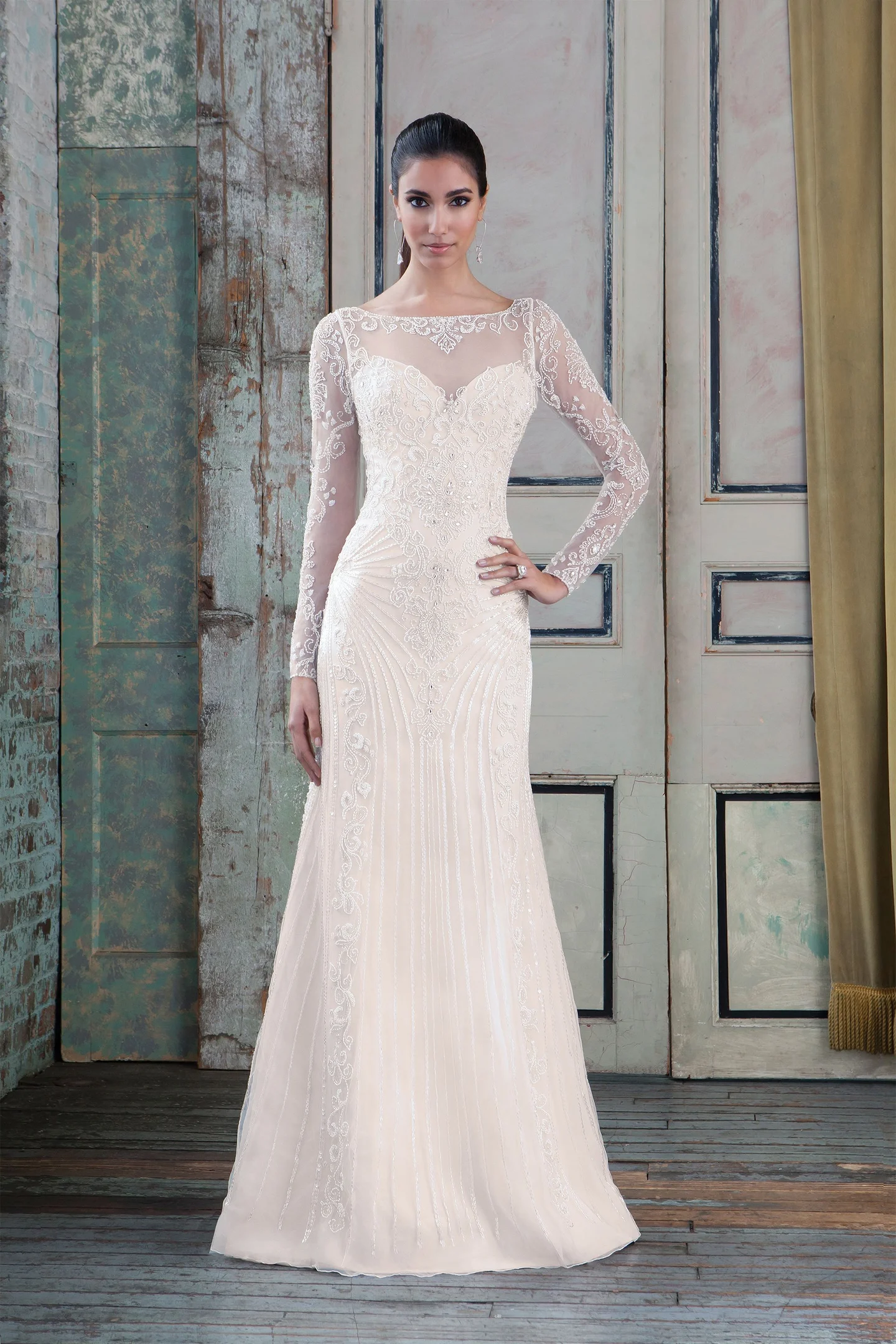 Beaded tulle straight gown with illusion sleeves and back, accentuated with a Sabrina neckline.